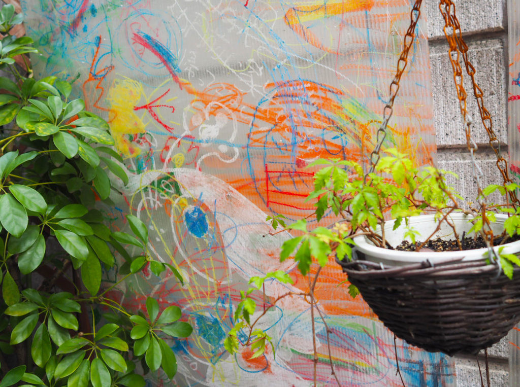 店外的牆邊收藏了一大片透明壓克力板,上面用蠟筆留下了自由的畫風,仔細一看還有「別輸給新冠肺炎!」等字眼,都是來自孩子們真實又無邪的聲音。